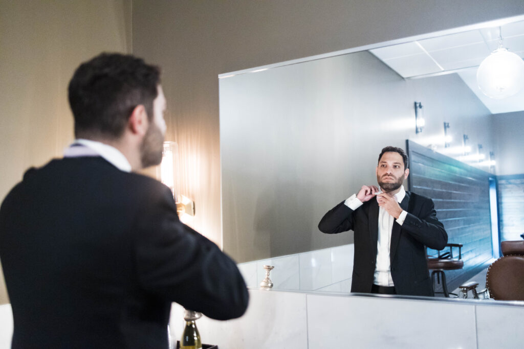 Once hair and makeup were done, they headed over to  Equestria West to get dressed and do the first look and more photos. One thing we absolutely love about this wedding is the attention to detail. Everything from the groom’s bowtie, to the table decorations, to the colors of the wedding party.