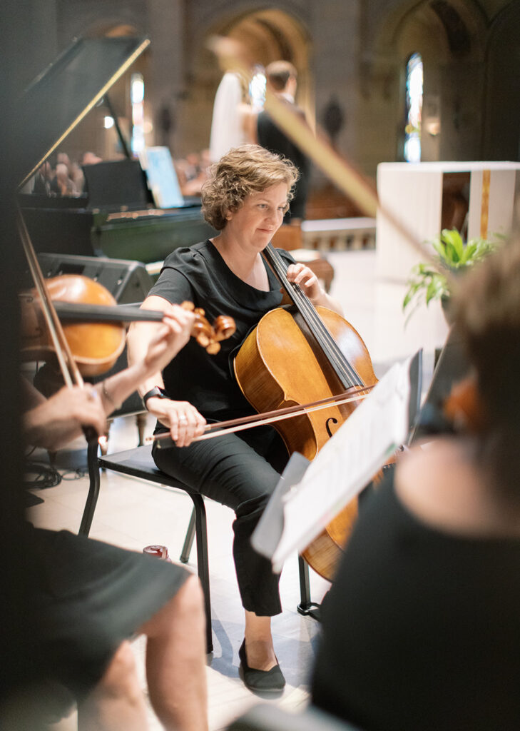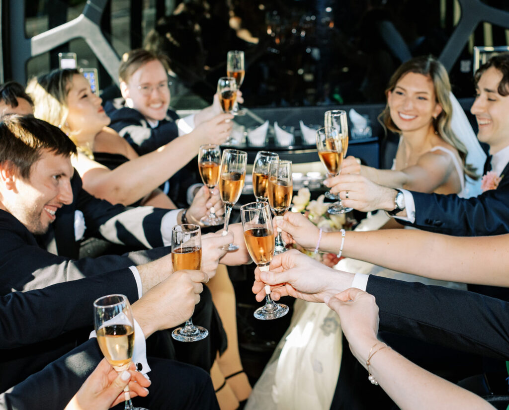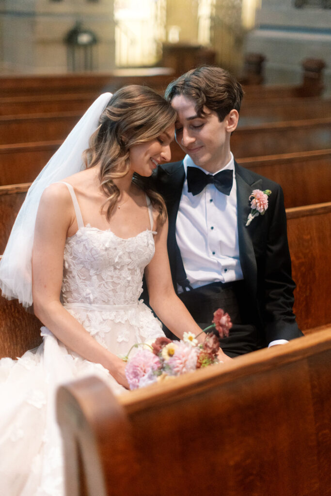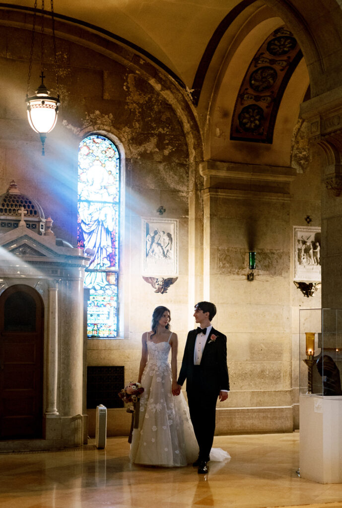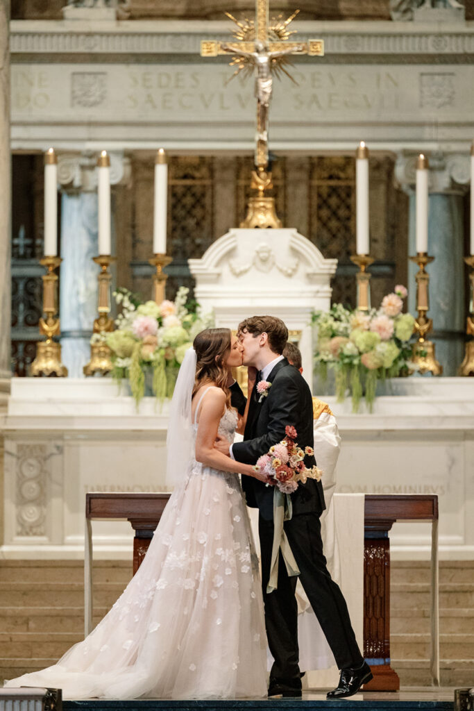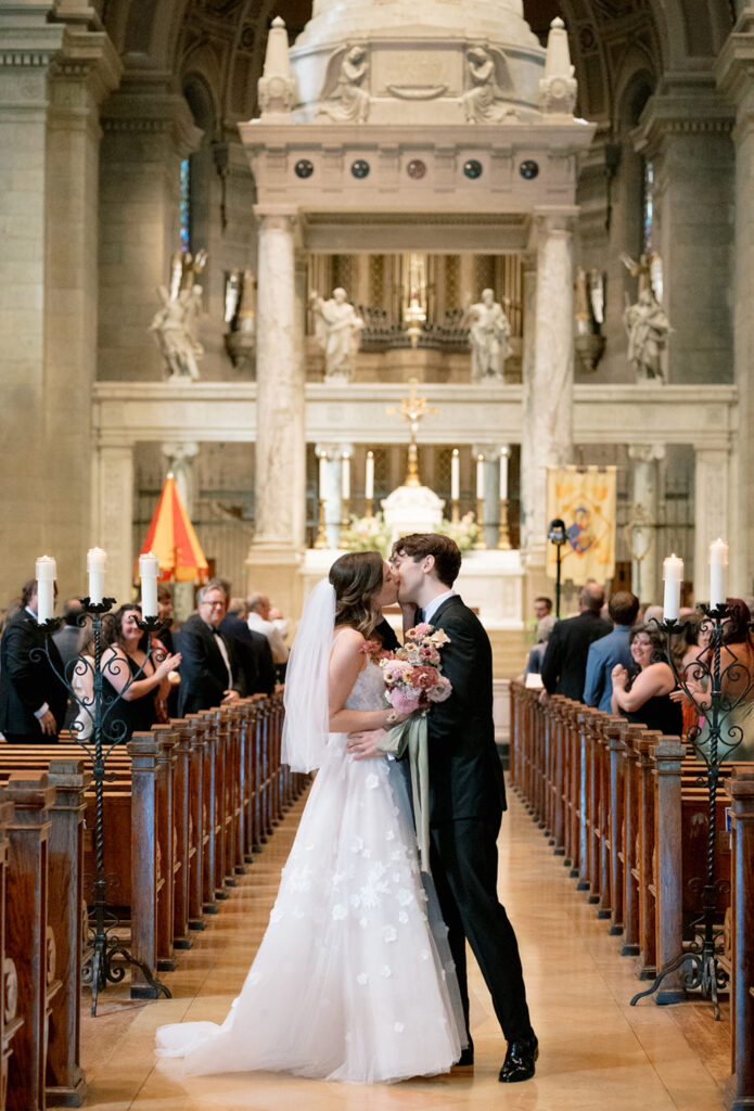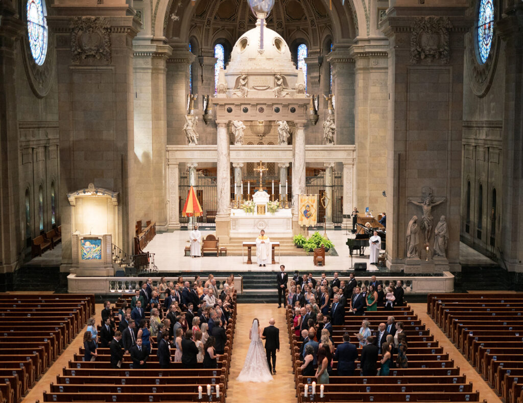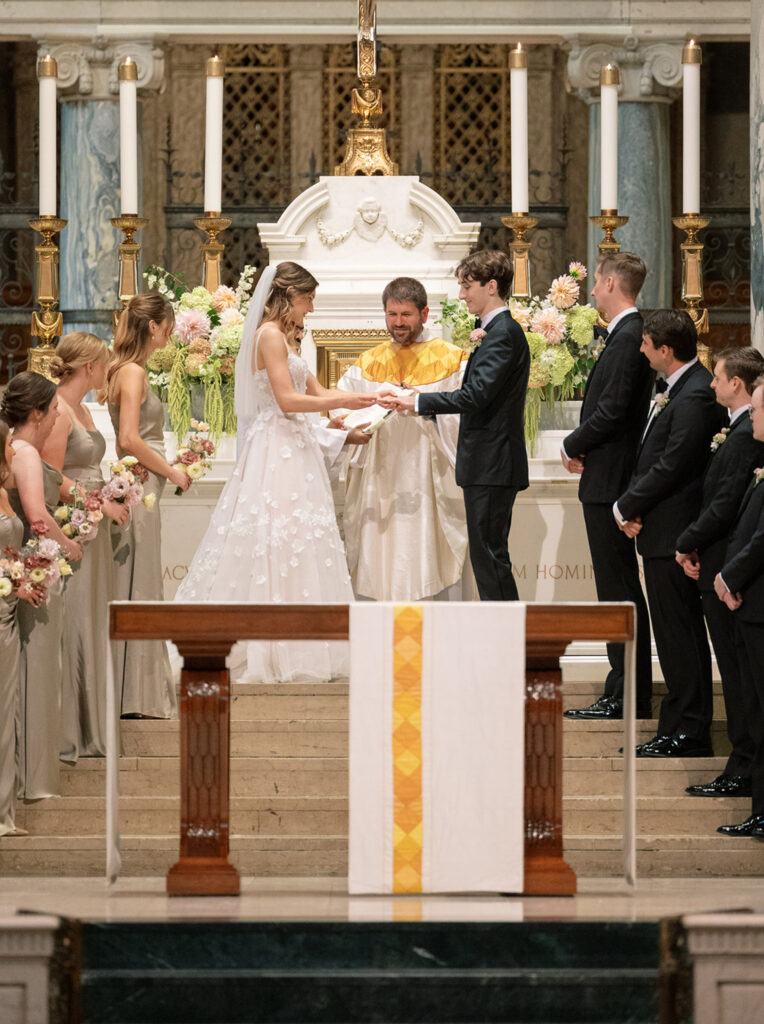 After that, the couple and their bridal party got on the bus to head to the ceremony at the Basilica of Saint Mary. Whenever the ceremony and reception are at two different locations, we always encourage the couple to provide transportation for themselves and their bridal party. One, it’s more fun to stay together, and two, it takes a lot of stress off the day. The couple chose to do a classic, catholic ceremony with music from The Birchwood String Quartet